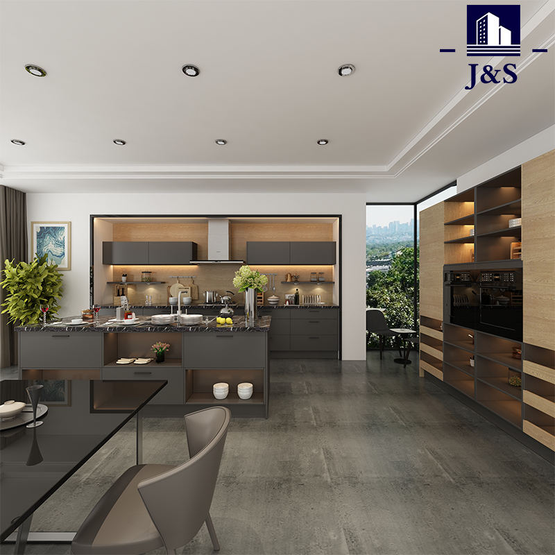 توفر J&S خزانة مطبخ مصقولة فاخرة. إنها خزانة مطبخ مدمجة وخزانة حائط مع إضاءة LED وأبواب قابلة للرفع للسماح للمستخدم بسهولة الحصول على الأشياء. باب مخزن الأخشاب مع اللون الرمادي الداكن يجعل هذا المطبخ تصميمًا مريحًا .